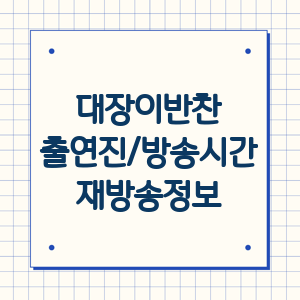 '대장이 반찬'은 매주 일요일 오후 4시 50분부터 6시 10분까지 MBC에서 방송됩니다. 첫 방송은 2024년 11월 10일이었으며, 총 4회에 걸쳐 방송될 예정입니다. 재방송은 매주 월요일 오전 11시 40분, 화요일 오후 11시 20분, 그리고 금요일 오후 9시 30분에 편성되어 있습니다.