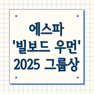 에스파는 '빌보드 우먼 인 뮤직 2025' 행사에 참석하여 '올해의 그룹상'을 수상했습니다. 이는 에스파가 지난해 보여준 뛰어난 음악적 성과와 글로벌 영향력을 인정받은 것으로, 에스파가 K-pop 대표 그룹으로 자리매김했음을 보여주는 의미 있는 수상이라고 할 수 있습니다.